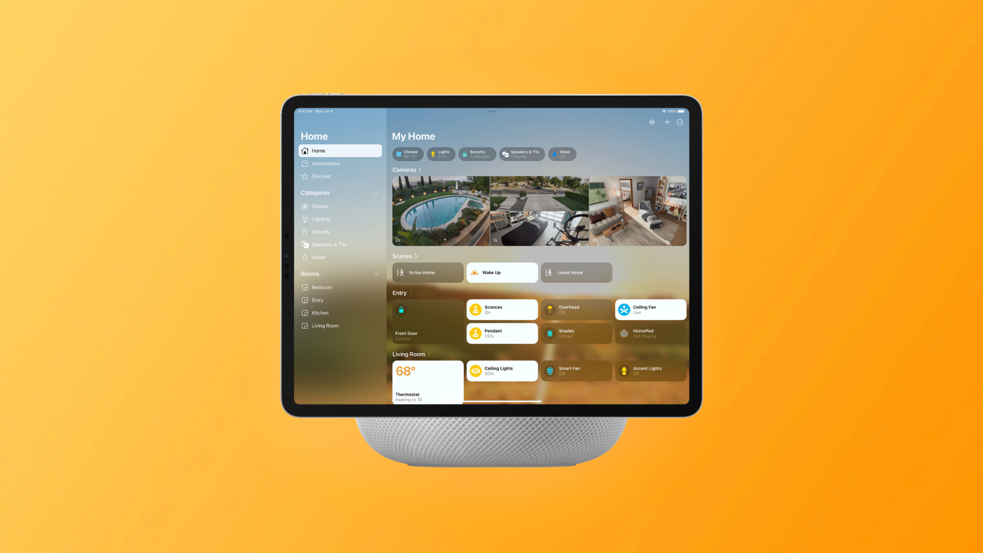 The smart home hub is designed to serve as a central control point for various connected devices within the home. It features a 7-inch display, resembling a square iPad, and can be mounted on a wall or placed on a speaker-style base. Equipped with a camera for facial recognition, the hub aims to provide personalized information such as calendar events, reminders, music suggestions, and news updates. The interface includes circular app icons arranged similarly to the Apple Watch home screen and runs on a customized version of tvOS.