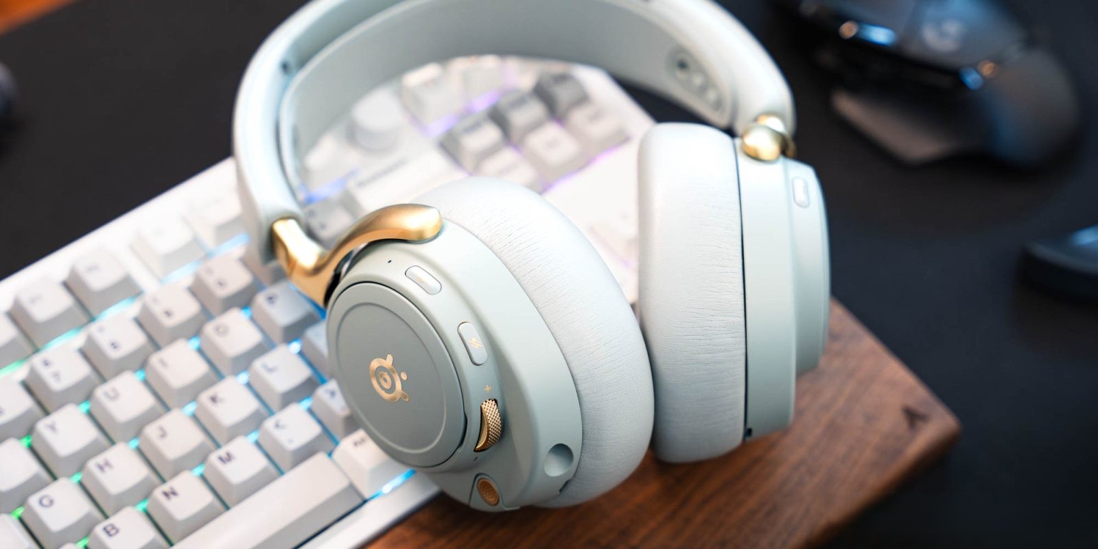 The headphones’ metal arms, finished in gold for the Sage variant, offer ample adjustability and maintain their position securely. The earcups can rotate 90 degrees, facilitating convenient storage. Overall, the Arctis Nova Elite’s construction emphasizes durability and comfort, making them suitable for prolonged gaming sessions or casual listening.
