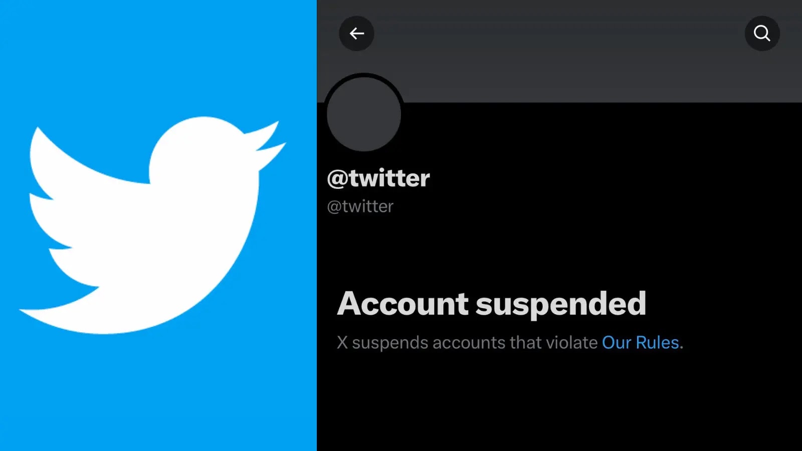 Visitors to the @twitter page now encounter a black screen with white text: Account suspended X suspends accounts that violate Our Rules, mirroring notifications for other rule-breaking profiles.